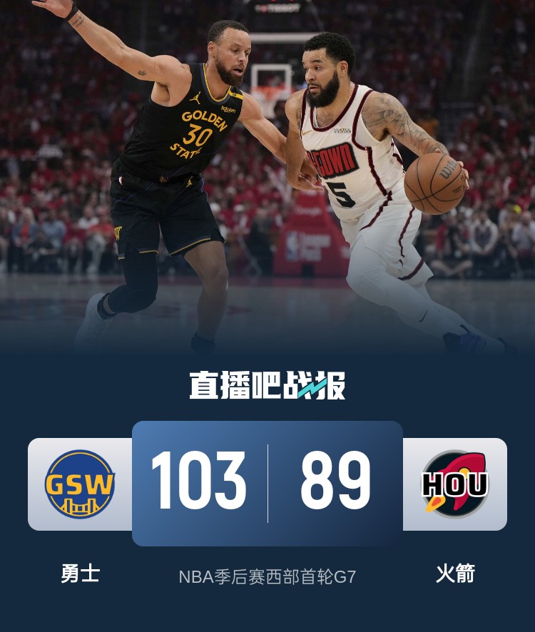 比赛上来,勇士就迅速反客为主打出8-2的开局取得领先,好在是火箭及时调整此后追了回来,不过首节最后一分半时间他们又没有得分,希尔德则抓住机会连中两记三分,次节火箭的进攻表现依旧没有起色,而勇士这边希尔德越投越疯,半场6个三分轰下22分,半场结束时火箭已经落后12分;下半场回来,阿门连续冲击帮助火箭迫近比分,分差最小时仅剩3分,而勇士这一节进攻受阻单节得分未能上20分,末节勇士先拿五分稳住局势,之后双方一直围绕着十分左右的分差展开拉锯,阿门由于抽筋也没再有过多发挥,最终勇士抢七力克火箭晋级西部半决赛。
