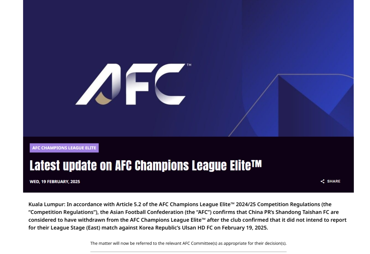 根据《亚足联冠军联赛精英赛2024/25竞赛规程》(简称"竞赛规程")第5.2条款规定,亚足联确认中国山东泰山足球俱乐部因明确表示不参加原定于2025年2月19日与韩国蔚山HD足球俱乐部进行的东亚区联赛阶段赛事,现被视为退出本届亚足联冠军联赛精英赛。