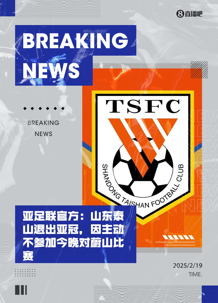 02月19日讯 亚足联官方发布公告,泰山确认不参加今晚对阵蔚山HD比赛,被视为退出亚冠。