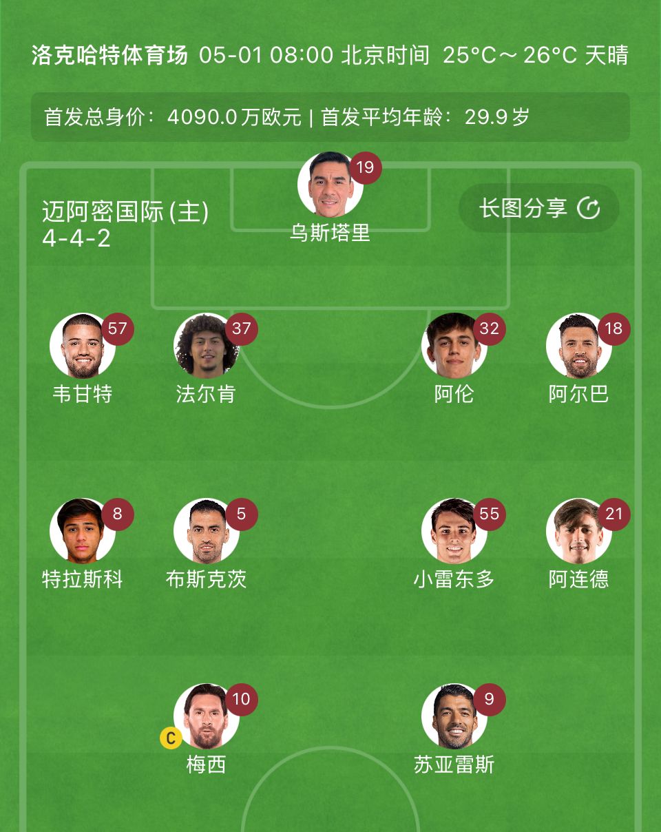 迈阿密国际首发:19-乌斯塔里、57-韦甘特、37-法尔肯、32-阿伦、18-阿尔巴、5-布斯克茨、55-雷东多、21-阿连德、8-特拉斯科、10-梅西、9-苏亚雷斯