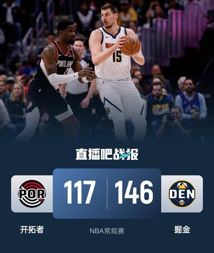 比赛上来,掘金就迅速占据场上主动取得领先,分差也是达到了两位数,整个第一节开拓者的防守完全形同虚设,让掘金全队投出20中15的高命中率,次节两队围绕着十分左右的分差展开拉锯,掘金单节得分再次突破30分,其中约基奇两节过后12中10高效砍下25分,半场结束时开拓者落后15分;下半场回来,开拓者的进攻也好起来了单节拿到37分,但掘金更加凶猛轰下42分,三节结束时分差达到20分,末节比赛已经失去悬念,穆雷与班顿冲突再吃T被驱逐,最终掘金大胜开拓者迎来七连胜。