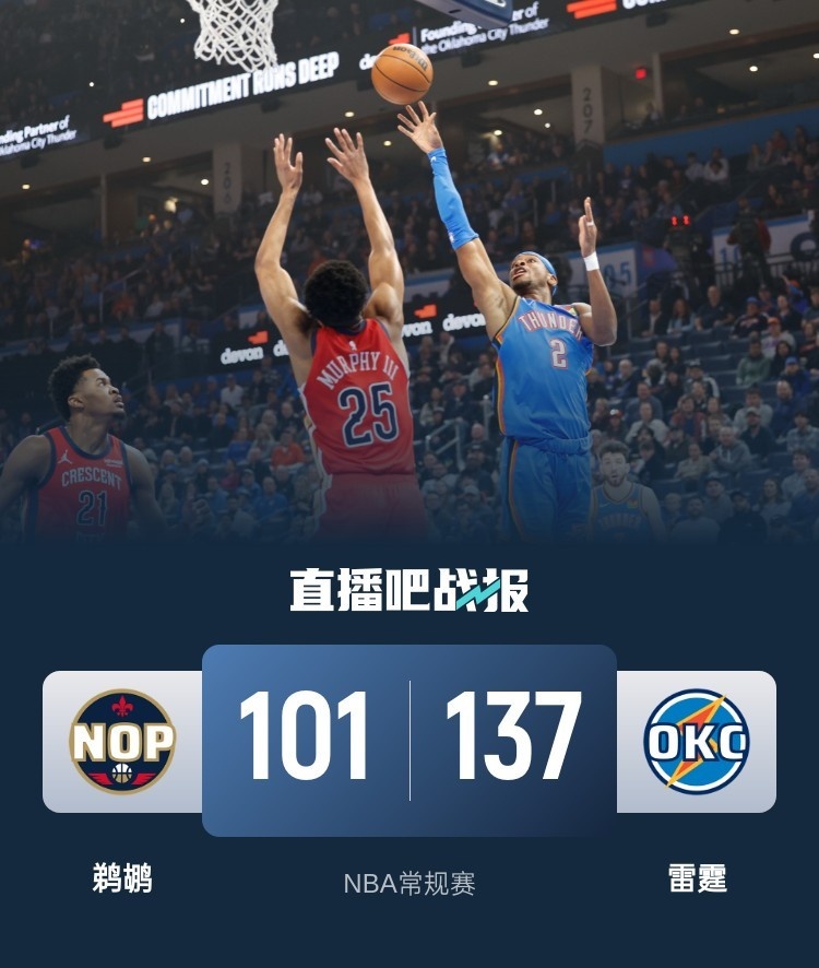 开场后雷霆就在外线展现出不错手感,鹈鹕则是频频出现失误,虽然墨菲一度帮助鹈鹕迫近比分,但雷霆在亚历山大带领下一波8-0的攻势将分差拉大到两位数。第二节上来卡鲁索和维金斯连中三分帮助雷霆继续扩大优势,鹈鹕虽然偶尔能够掀起一些反扑但都被雷霆迅速浇灭,半场过后雷霆领先到22分。易边再战,鹈鹕在进攻端加快速度抢分,但是他们防守端完全 无法限制雷霆,杰伦-威廉姆斯和亚历山大轮番砍分帮助球队继续掌控场上局面,最后一节鹈鹕也无力追分,最终雷霆137-101大胜鹈鹕取得6连胜,鹈鹕遭遇9连败。
