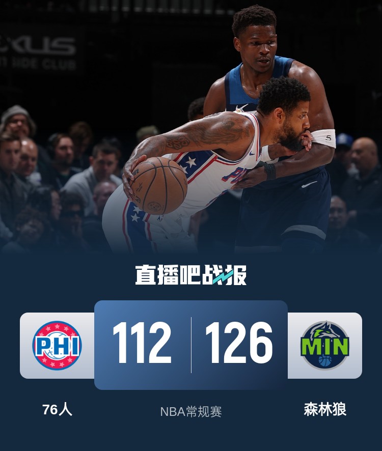 比赛开始,双方上来都很是慢热,打了半节都没有得分上双,随后格莱姆斯联手朗尼-沃克带队取得领先,爱德华兹接连造杀伤回应,迪文岑佐三分帮助森林狼领先2分,次节森林狼上来接连三分一波13-4领先到双位数,格莱姆斯里突外投连砍7分止血,但爱德华兹接连三分还能回应,半场森林狼还领先4分。下半场,双方展开拉锯战,乌布雷接连突破追分,但森林狼能给出回应,康利压哨三分还领先3分,末节森林狼外线多点开花,连中5记三分再次领先到双位数,76人追分森林狼总能回应保持住十几分领先,双方换上替补练兵,最终森林狼力克76人。