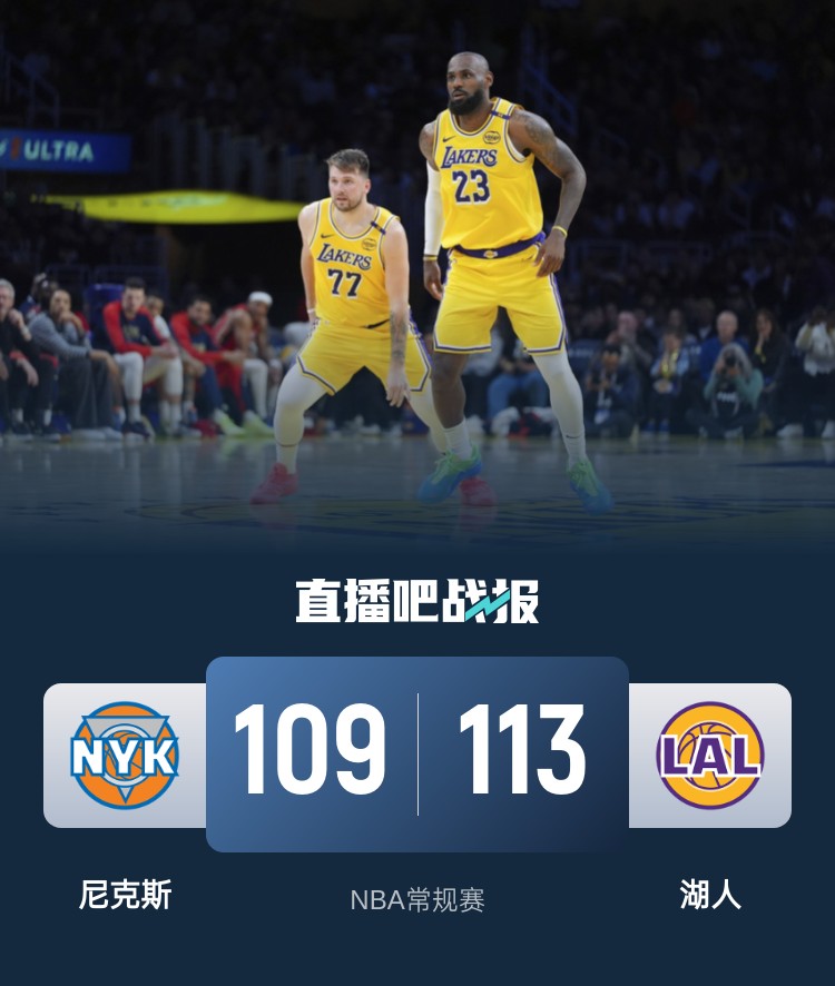 比赛开始,双方都迅速进入状态,布伦森和东契奇展开对飙,东契奇和詹姆斯接连喂饼杰米森,湖人8-0取得领先,但布伦森压哨中投再进追到差4分,次节湖人进攻端陷入停滞,阿努诺比外线弹无虚发单节轰下13分,尼克斯打出进攻高潮直接反超比分,詹姆斯连续突破回应,半场尼克斯反超9分。下半场,布伦森连续突破取分,尼克斯牢牢掌握住双位数领先,里夫斯终于命中首个运动战进球,克内克特压哨三分追到差8分,末节双方都是高强度防守,湖人给机会始终把握不住,文森特和詹姆斯接连底角三分命中,湖人8-0追到仅差1分,比赛进入白热化,文森特和詹姆斯又是接连3记三分终于反超比分,布伦森2+1再扳平,双方进入加时。加时赛,东契奇接连高难度中远投连砍5分,里夫斯三分也进,布伦森连续突破或造杀伤砍下6分后崴脚受伤还坚持罚球,海斯和詹姆斯接连罚球,阿努诺比关键加罚不中,最终湖人加时113-109险胜尼克斯,豪取8连胜。