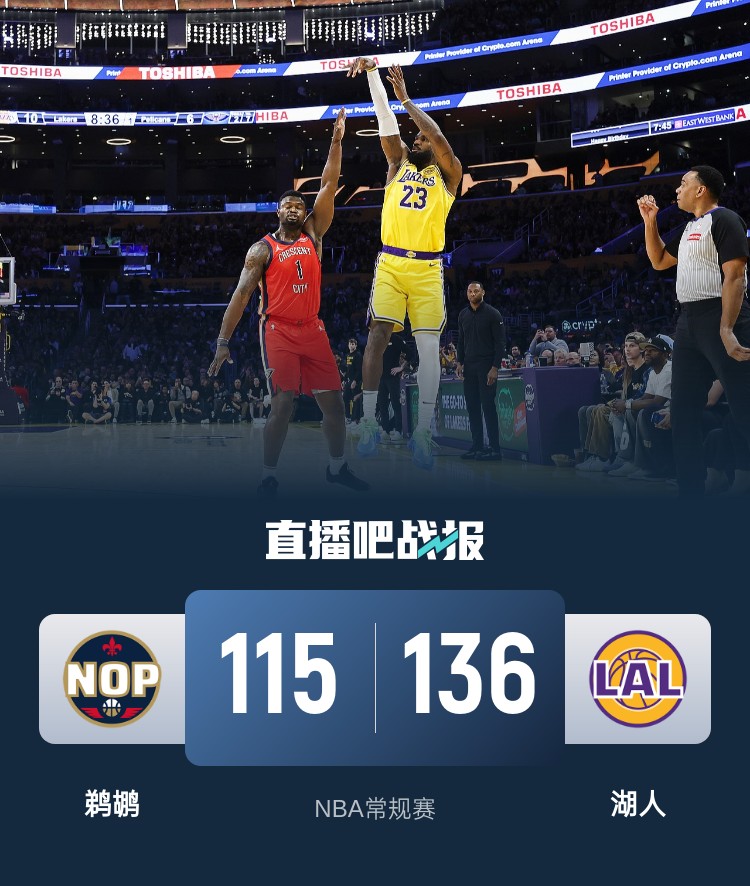 比赛开始,詹姆斯通过一记三分达成50000分神迹,随后东契奇连进3记三分带队13-2攻击波拉开比分,锡安连续攻击内线止血,首节湖人领先13分,次节霍金斯接连三分追分,锡安持续冲击内线单节砍13分,鹈鹕20-7攻击波一度追平比分,詹姆斯接连三分带队回应11-0攻击波止血,海斯连续内线吃饼暴扣半场砍19分,湖人依然领先10分。下半场,双方接连突破造杀伤展开拉锯战,东契奇三分继续火热,而且接连送助攻,湖人打出16-3攻击波直接拉开20分以上领先,末节锡安继续冲击内线挡不住,但詹姆斯里突外投强势回应,分差始终保持在20分左右,最终湖人136-115轻取鹈鹕,拿到7连胜。