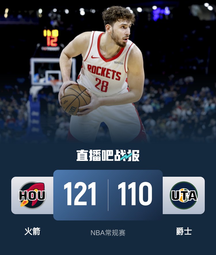 火箭(48-26):申京33分10板2助2帽、杰伦-格林21分8板6助、阿门15分10板5助、伊森15分7板2助、史密斯11分9板1助、狄龙10分3板3助、兰代尔10分3板、范弗里特4分1板6助、霍勒迪2分1助