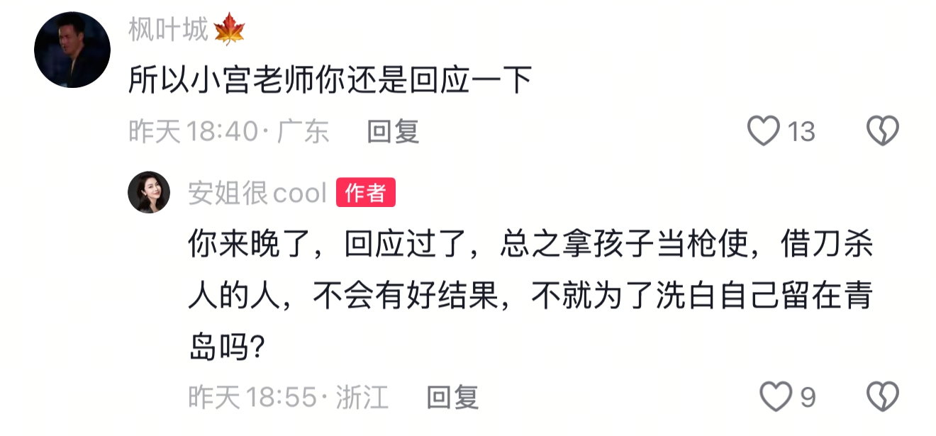 昨日,在网友不停的追问下,李艳再次对这则“刘维伟母亲”假声明进行了回复——一个男人要靠自己“老妈”上网,并带上“两个女儿说的”来污蔑原配上位继续厚颜无耻的留在原地赚钱,也是天下第一牛!见过不要脸的,没见过这么不要脸的,天天跟女儿说不干了,下课了,回东北了,这边找人写作文泼脏水,扭转舆论,两个女儿为此恨到发指,他赚再多的钱又怎么样?失去至亲的信任,祝他在青岛长长久久,和三小早生贵子。