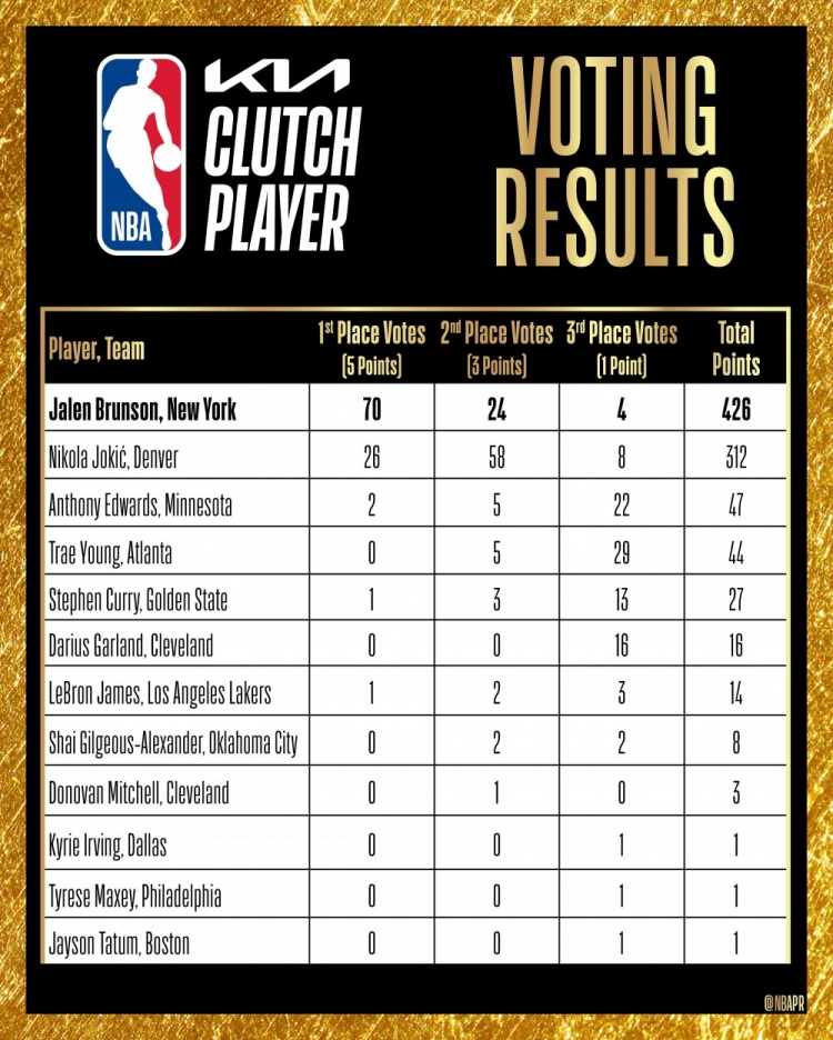年度最佳关键球员候选人由30支球队的主教练投票选出,最终三位候选人是布伦森、爱德华兹和约基奇。