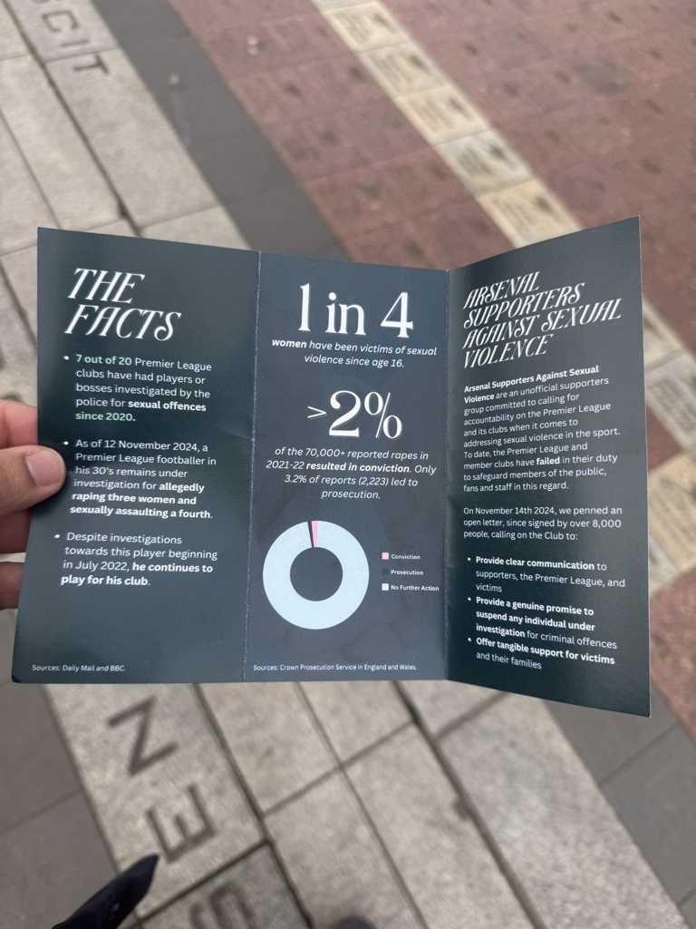 虽然鲍文的进球抢走了头条,但开球前在球场外举行的球迷抗议活动也引起了广泛讨论。阿森纳球迷反性暴力组织在酋长球场外举着写有 “爱阿森纳,恨强奸犯”的牌子,随后,人们看到该支持者组织散发传单,进一步说明了他们的主张。
