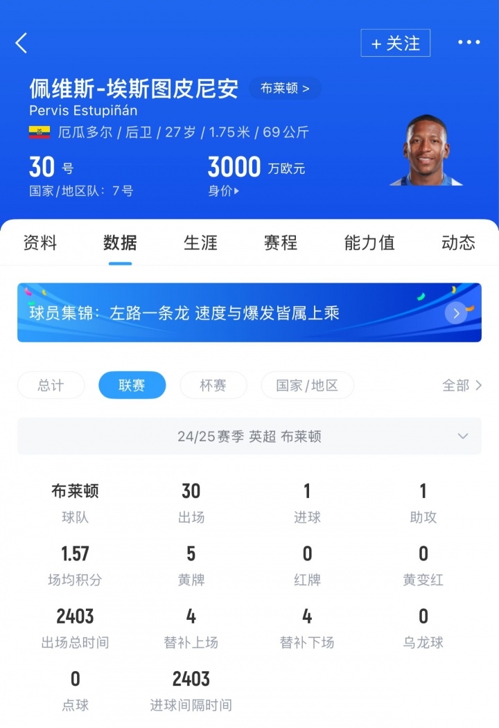 现年27岁的厄瓜多尔左后卫埃斯图皮尼安,上赛季代表布莱顿出战30场英超,贡献1粒进球和1次助攻,目前埃斯图皮尼安的德转身价为3000万欧元。