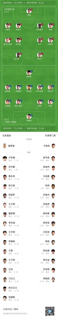 北京国安首发:34-侯森、4-李磊、5-恩加德乌(F)、16-冯博轩、30-范双杰、6-池忠国、7-塞尔吉尼奥、11-林良铭、23-达万(F)、9-张玉宁、29-法比奥(F)